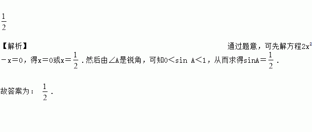 【解析】通过题意,可先解方程2x2-x=0,得x=0或x=.然后由∠A是锐角,可知0<sin A<1,从而求得sinA=. 故答案为: .