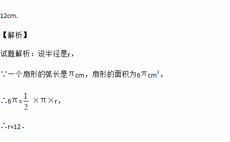 一个扇形的面积为6πcm2,弧长为πcm,则该扇形的半径为 .