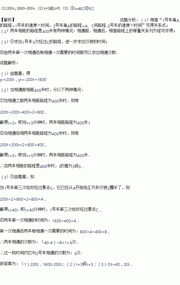 Èçͼ£¬Ä³¾°ÇøÄÚµÄÓÎÀÀ³µÂ·ÏßÊDZ߳¤Îª800Ã×µÄÕý·½ÐÎABCD£¬ÏÖÓÐ1ºÅ¡¢2ºÅÁ½ÓÎÀÀ³µ·Ö±ð´Ó³ö¿ÚAºÍ¾°µãCͬʱ³ö·¢£¬1ºÅ³µË³Ê±Õ루¼´´ÓA¡úB¡úC¡úD¡úAµÄ˳Ðò£©¡¢2ºÅ³µÄæÊ±Õ루¼´´ÓC¡úB¡úA¡úD¡úCµÄ˳Ðò£©ÑØ»·ÐηÁ¬ÐøÑ»·ÐÐÊ»£¬¹©ÓοÍËæÊ±Ãâ·Ñ³Ë³µ£¨ÉÏ¡¢Ï³µµÄʱ¼äºöÂÔ²»¼Æ£©£¬Á½³µËٶȾùΪ200Ã×/·Ö£®ÉèÐÐʻʱ¼äΪt·Ö£®