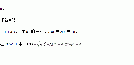 如图,△ABC中,CD⊥AB于D,E是AC的中点.若AD=6,DE=5,则CD的长等于 .