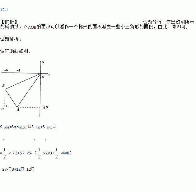 如图,△AOB中,A、B两点的坐标分别为(-4,-6),(-6,-3),求△AOB的面积。(提示:△AOB的面积可以看作一个梯形的面积减去一些小三角形的面积).
