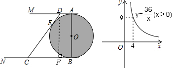 分析:过D作DF垂直于CB,根据切线的性质及垂直定义得到∠ADF,∠DAB,∠DFB为直角,可得四边形ABFD为矩形,根据矩形的对边相等可得DF=AB,AD=BF,又DA与DE为圆O的切线,根据切线长定理得到DA=DE,同理得到CE=CB,可得CD=CE+DE=AD+CB,表示出CD,CF=CB-FB=CB-AD,表示出CF,再由DF=AB,由AB的长得出DF的长,在直角三角形CDF中,根据勾股定理列出关于x与y的关系式,整理后可得出y与x的反比例关系式,同时根据x表示线段长,可得x大于0,即反比例为第一象限的部分,画出图象即可.