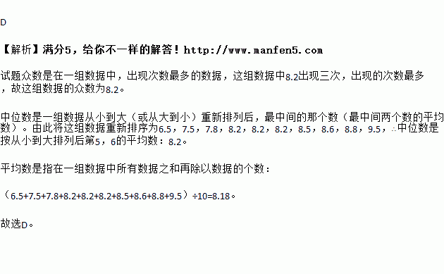 在2013年“崇左市初中毕业升学体育考试”测试中,参加男子掷实心球的10名考生的成绩记录如下(单位:米):7.5、6.5、8.2、7.8、8.8、8.2、8.6、8.2、8.5、9.5,则该组数据的众数、中位数、平均数依次分别是