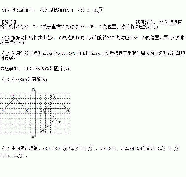 如图,在所给网格图(每小格均为边长是1的正方形)中完成下列各题:(1)作出格点△关于直线DE对称的△;(2)作出△绕点顺时针方向旋转后的△;(3)△的周长为_____;(保留根号)