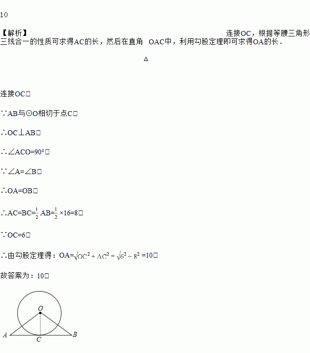 如图,AB与⊙O相切于点C,∠A=∠B,⊙O的半径为6,AB=16,则OA的长为_____.