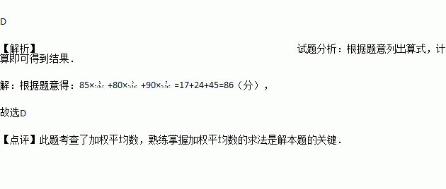 小王参加某企业招聘测试,他的笔试、面试、技能操作得分分别为85分、80分、90分,若依次按照2:3:5的比例确定成绩,则小王的成绩是( )