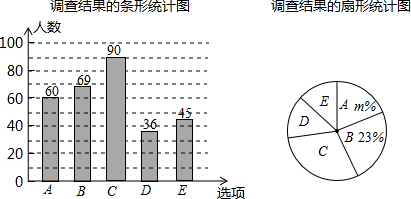 分析:(1)由B的人数除以占的百分比求出总人数,即可求出C的人数,以及m的值;