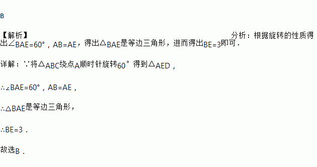 如图,将△ABC绕点A顺时针旋转 60°得到△AED,若线段AB=3,则BE=( )