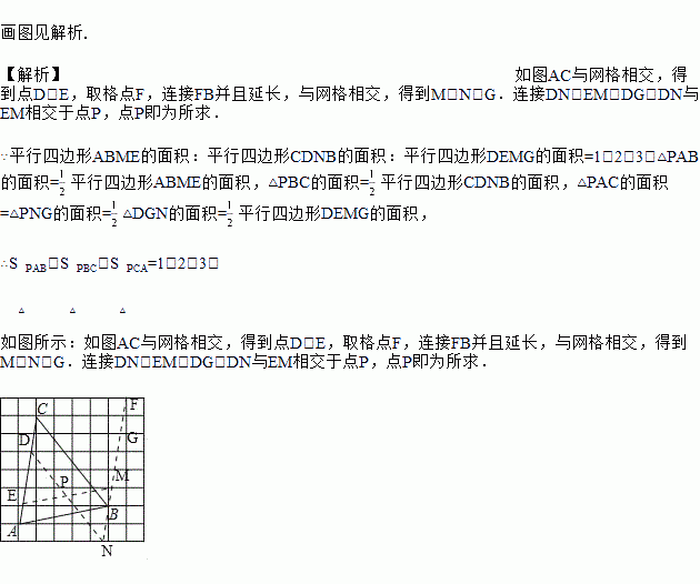 在每个小正方形的边长为1的网格中,点A、B、C均在格点上,在△ABC的内部有一点P,满足S△PAB:S△PBC:S△PCA=1:2:3,请在如图所示的网格中,用无刻度直尺画出点P(保留画图痕迹)