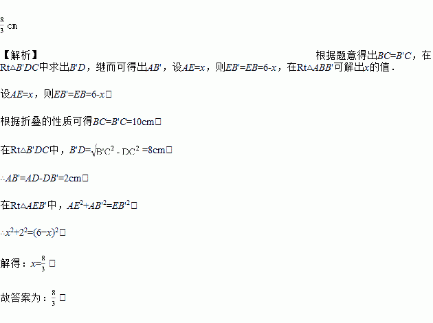 如图,长方形纸片ABCD中,AB=CD=6cm,BC=AD=10cm,点E在AB边上,将三角形沿C所直线折叠,使B落的B′处,则AE的长为______________.