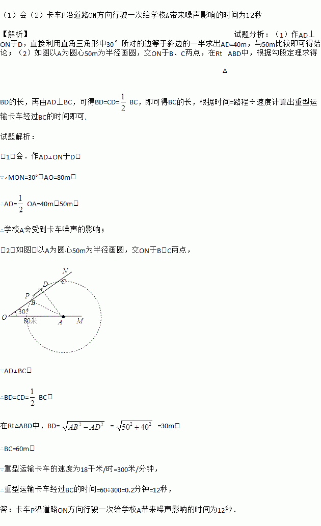 如图,∠MON=30°,在距离O点80米的A处有一所学校,当重型运输卡车P沿道路ON方向行驶时,距离卡车50米范围内都会受到卡车噪声的影响.