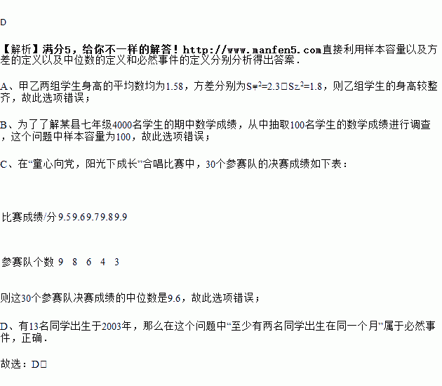 A. 甲乙两组学生身高的平均数均为1.58,方差分别为S甲2=2.3,S乙2=1.8,则甲组学生的身高较整齐
