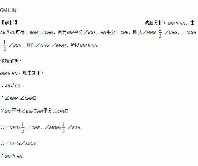 如图,AB∥CD,直线EF交AB、CD于点G、H.如果GM平分∠BGF,HN平分∠CHE,那么,GM与HN平行吗?为什么?