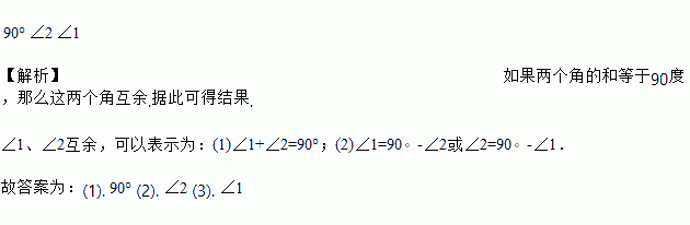∠1、∠2互余,可以表示为:(1)∠1+∠2=________;(2)∠1=90-_______或∠2=90-______.