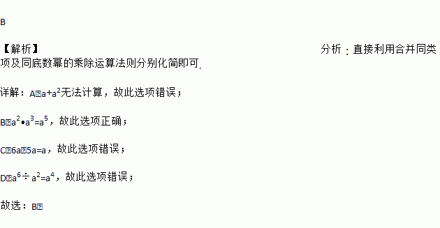 A. a+a2=a3 B. a2•a3=a5 C. 6a﹣5a=1 D. a6÷a2=a3