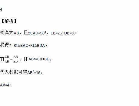 如图,林林在A时测得某树的影长为2 m,B时又测得该树的影长为8 m,若两次日照的光线互相垂直,则该树的高度为________ .