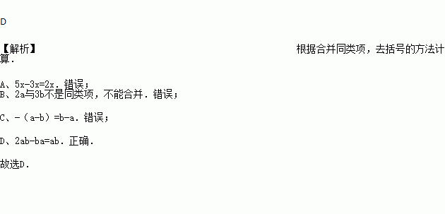 A. 5x-3x=2 B. 2a+3b=5ab