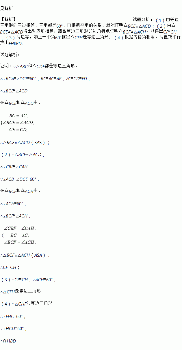 如图,已知点B、C、D在同一条直线上,△ABC和△CDE都是等边三角形.BE交AC于F,AD交CE于H,求证: