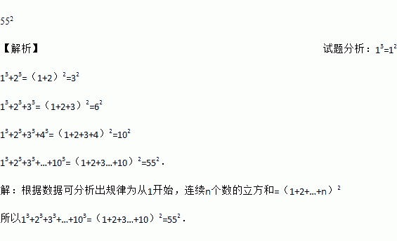 552 【解析】试题分析:13=12 13+23=(1+2)2=32 13+23+33=(1+2+3)2=62 13+23+33+43=(1+2+3+4)2=102 13+23+33+…+103=(1+2+3…+10)2=552. 【解析】 根据数据可分析出规律为从1开始,连续n个数的立方和=(1+2+…+n)2 所以13+23+33+…+103=(1+...