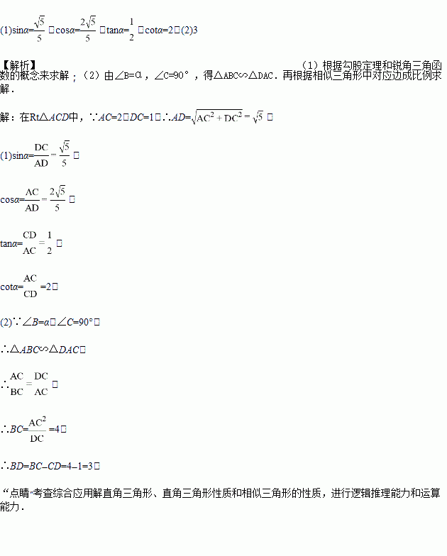 如图,在Rt△ABC中,∠C=90°,D是BC边上一点,AC=2,CD=1,设∠CAD=α.