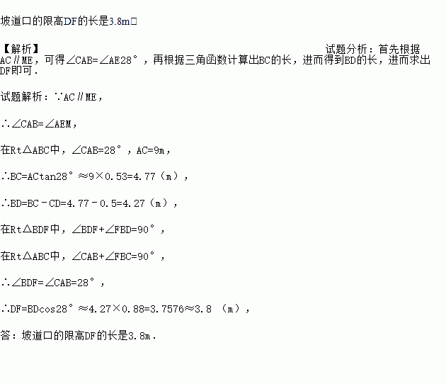随着人们经济收入的不断提高,汽车已越来越多地进入到各个家庭.某大型超市为缓解停车难问题,建筑设计师提供了楼顶停车场的设计示意图.按规定,停车场坡道口上坡要张贴限高标志,以便告知车辆能否安全驶入.如图,地面所在的直线ME与楼顶所在的直线AC是平行的,CD的厚度为0.5m,求出汽车通过坡道口的限高DF的长(结果精确到0.1m,sin28°≈0.47,cos28°≈0.88,tan28°≈0.53).