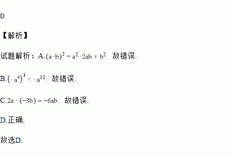 A. (a﹣b)2=a2﹣b2 B. (﹣a4)3=a7