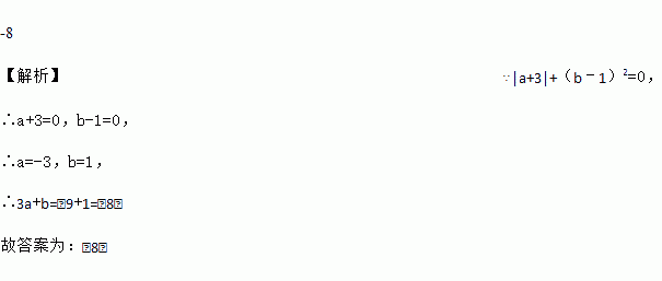 -8 【解析】∵|a+3|+(b﹣1)2=0, ∴a+3=0,b-1=0, ∴a=-3,b=1, ∴3a+b=﹣9+1=﹣8, 故答案为:﹣8.