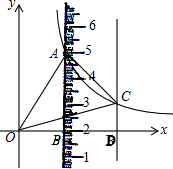 (x>0)交于点A、C,与x轴交于点B、D,连结AC,AO,CO,点A、B的刻度分别为5、2(单位:cm),直尺的宽度为2cm,OB=2cm.