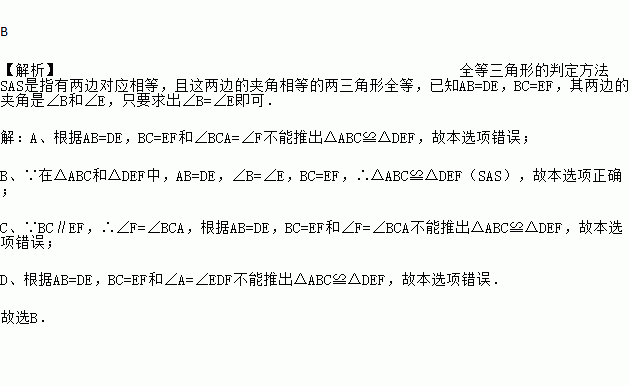 A. ∠BCA=∠F; B. ∠B=∠E; C. BC∥EF ; D. ∠A=∠EDF