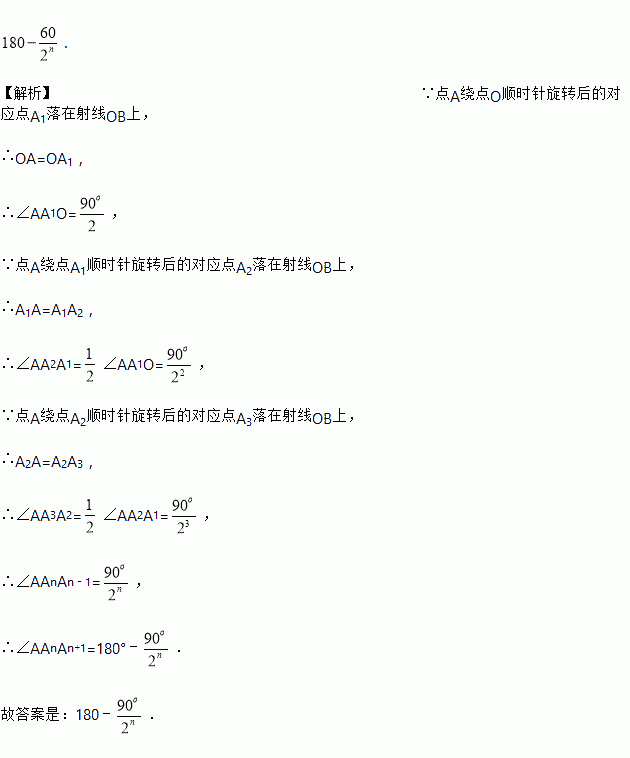 如图,已知∠AOB=120°,点A绕点O顺时针旋转后的对应点A1落在射线OB上,点A绕点A1顺时针旋转后的对应点A2落在射线OB上,点A绕点A2顺时针旋转后的对应点A3落在射线OB上,…,连接AA1,AA2,AA3…,依此作法,则∠AAnAn+1等于______度.(用含n的代数式表示,n为正整数)