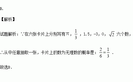 在六张卡片上分别写有π,,1.5,-3,0,六个数,从中任意抽取一张,卡片上的数为无理数的概率是( )