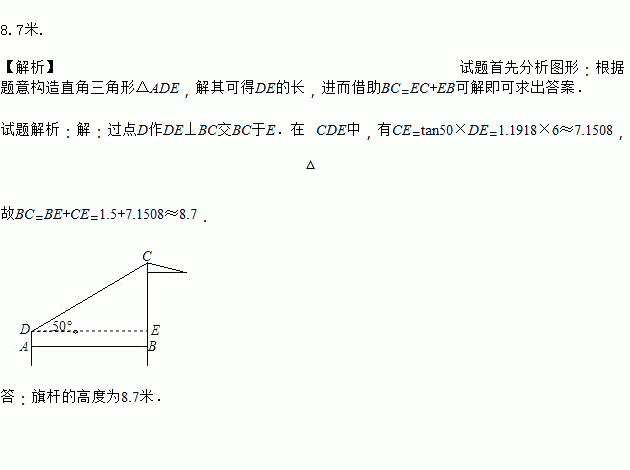 如图,在离旗杆6米的A处,用测角仪测得旗杆顶端C的仰角为50度,已知测角仪高AD=1.5米,求旗杆的高度.(tan 50°=1.1918,sin50°=0.7660,结果精确到0.1米)