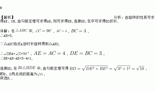 如图△ABC中,∠C=90°,AC=4,BC=3,将△ABC绕点A逆时针旋转,使点C落在线段AB上的点E处,点B落在点D处,则B、D两点间的距离为( )