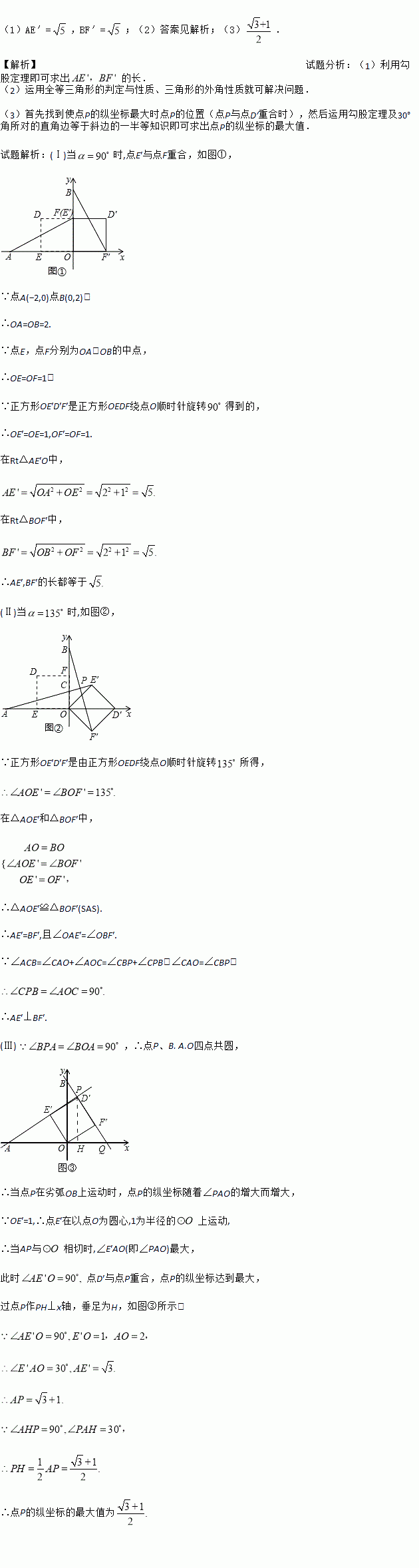 (1)AE′=,BF′=;(2)答案见解析;(3). 【解析】试题分析:(1)利用勾股定理即可求出的长. (2)运用全等三角形的判定与性质、三角形的外角性质就可解决问题. (3)首先找到使点P的纵坐标最大时点P的位置(点P与点D′重合时),然后运用勾股定理及30°角所对的直角边等于斜边的一半等知识即可求出点P的纵坐标的最大值. 试题解析:(Ⅰ)当时,点E′与点F重合,如图①, ...