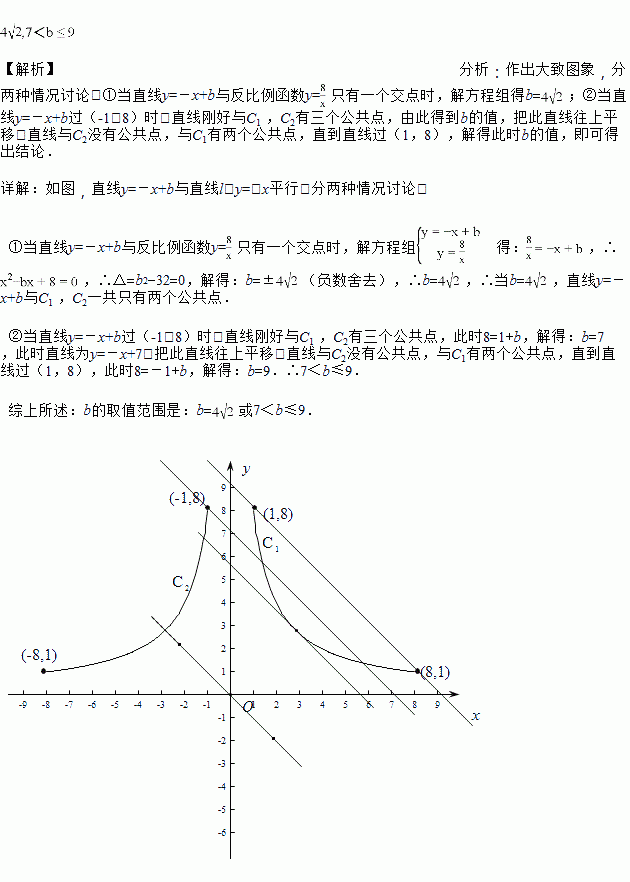 反比例函数y=(1≤x≤8)的图象记为曲线C1,将C1沿y轴翻折,得到曲线C2,直线y=-x+b 与C1 ,C2一共只有两个公共点,则b的取值范围是______________________.