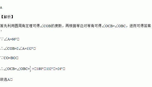 如图,点A,B,C均在⊙O上,若∠A=66°,则∠OCB的度数是( )