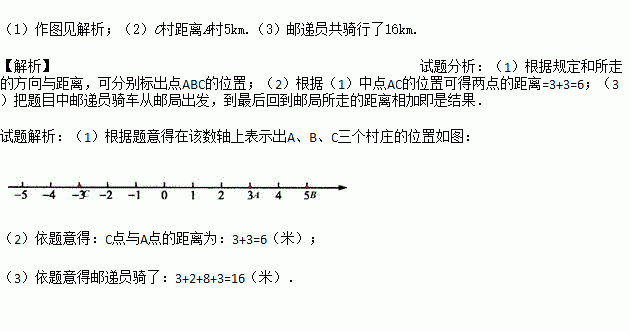 (1)以邮局为原点,以向东方向为正方向,用1cm表示2km,画出数轴,并在该数轴上表示出A、B、C三个村庄的位置;