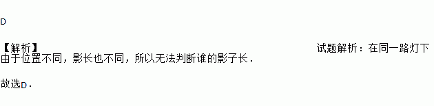 在同一时刻的阳光下,小明的影子比小强的影子长,那么在同一路灯下 ( )