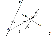 分析:以A为圆心,任意长为半径画弧,与AB、AC分别交于两点,再以这两点为圆心,大于两交点距离的一半长为半径画弧,两弧在角内部交于一点,以A为圆心,经过此交点作一条射线,即为∠BAC的角平分线,连接DE,分别以D、E为圆心,大于DE一半长为半径画弧,分别交于两点,经过两交点作一条直线,即为DE的垂直平分线,与角平分线交于P点,即为所求的点.