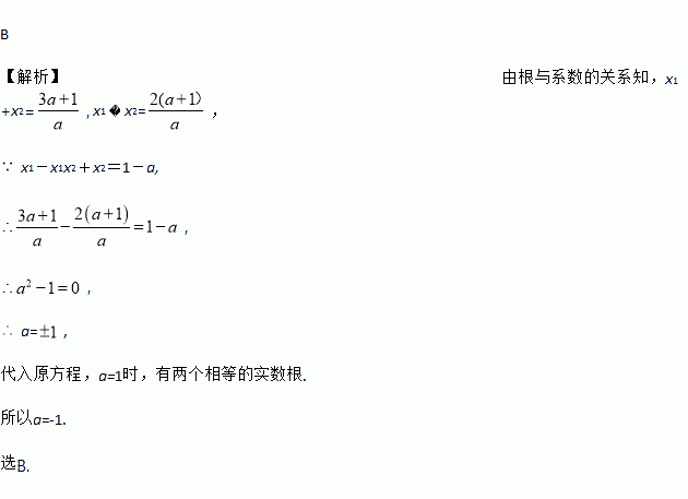 B 【解析】由根与系数的关系知,x1+x2=, x1x2=, x1-x1x2+x2=1-a, , , a=, 代入原方程,a=1时,有两个相等的实数根. 所以a=-1. 选B.