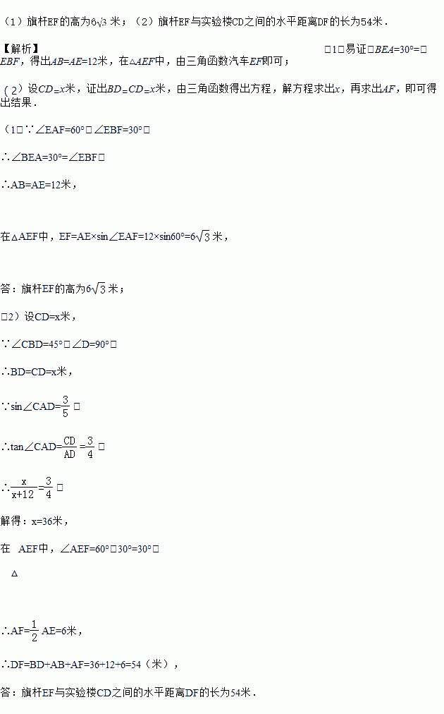 (2)求旗杆EF与实验楼CD之间的水平距离DF的长.