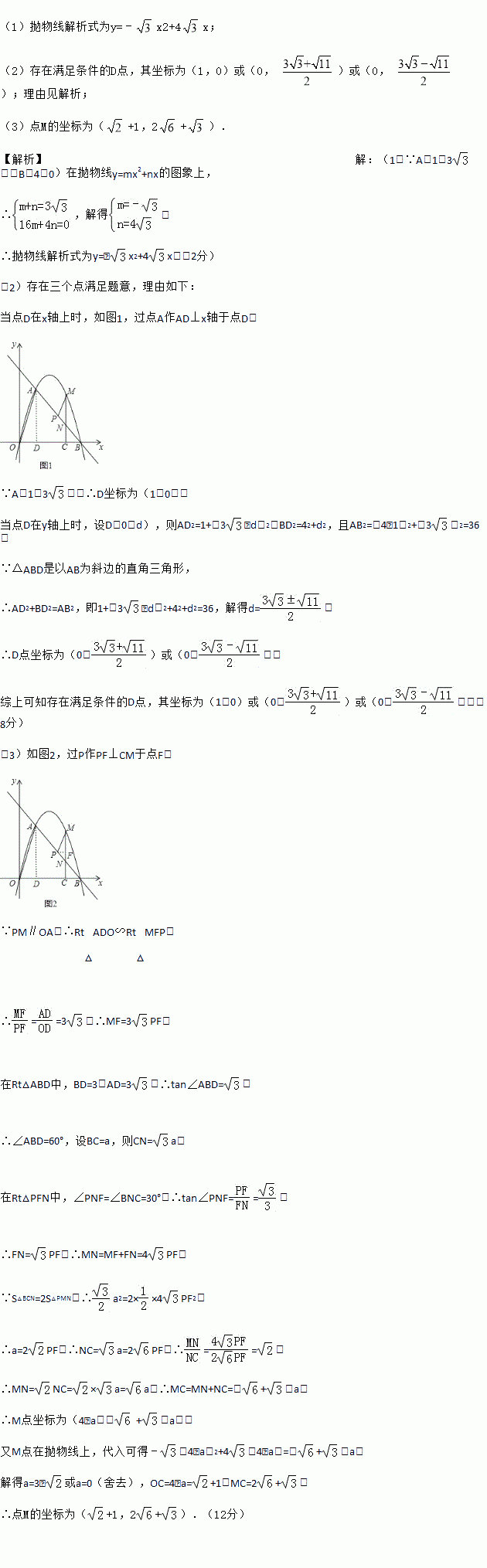 (3)点P是线段AB上一动点,(点P不与点A、B重合),过点P作PM∥OA,交第一象限内的抛物线于点M,过点M作MC⊥x轴于点C,交AB于点N,若△BCN、△PMN的面积S△BCN、S△PMN满足S△BCN=2S△PMN,求出