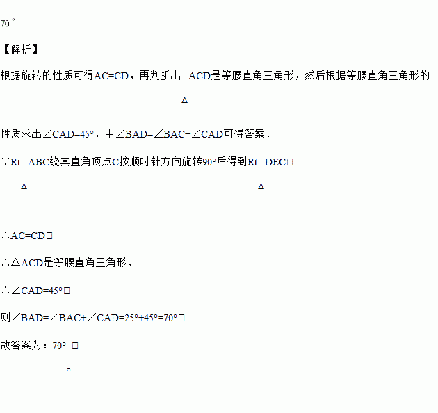 如图,将绕直角顶点C顺时针旋转,得到,连接AD,若,则______.