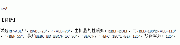 如图,将矩形纸片ABCD折叠,使点D与点B重合,点C落在点处,折痕为EF,若∠ABE=20°,那么∠EFC′的度数为 .