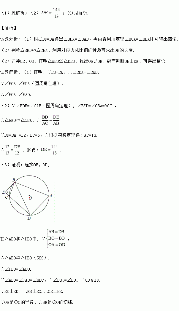 £¨1£©¼û½âÎö£»£¨2£©£»(3)¼û½âÎö. ¡¾½âÎö¡¿ ÊÔÌâ·ÖÎö£º£¨1£©¸ù¾ÝBD=BAµÃ³ö¡ÏBDA=¡ÏBAD£¬ÔÙÓÉÔ²ÖܽǶ¨Àí¡ÏBCA=¡ÏBDA¼´¿ÉµÃ³ö½áÂÛ. £¨2£©Åжϡ÷BED¡×¡÷CBA£¬ÀûÓöÔÓ¦±ß³É±ÈÀýµÄÐÔÖÊ¿ÉÇó³öDEµÄ³¤¶È. £¨3£©Á¬½ÓOB£¬OD£¬Ö¤Ã÷¡÷ABO¡Õ¡÷DBO£¬ÍƳöOB¡ÎDE£¬¼Ì¶øÅжÏOB¡ÍDE£¬¿ÉµÃ³ö½áÂÛ. ÊÔÌâ½âÎö£º£¨1£©Ö¤Ã÷£º¡ßBD=BA£¬¡à¡ÏBDA=¡ÏB...