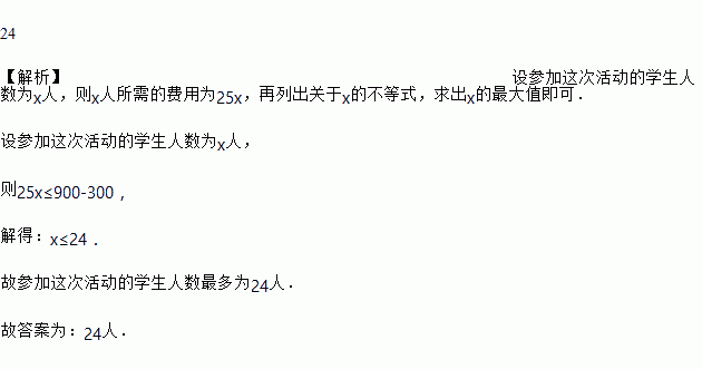 在一次社会实践活动中,某班可筹集到900元的活动经费,若此次活动租车需300元,此外平均每个学生还需经费25元,则参加这次活动的学生人数最多为______ 人.
