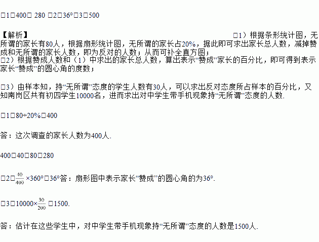(3)若南岗区共有初四学生10000名,请估计在这些学生中,对中学生带手机现象持“无所谓”态度的人数是多少?