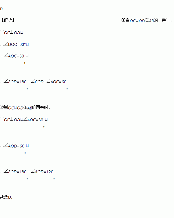 在直线AB上任取一点O,过点O作射线OC,OD,使OC⊥OD,当∠AOC=30°时,∠BOD的度数是( )