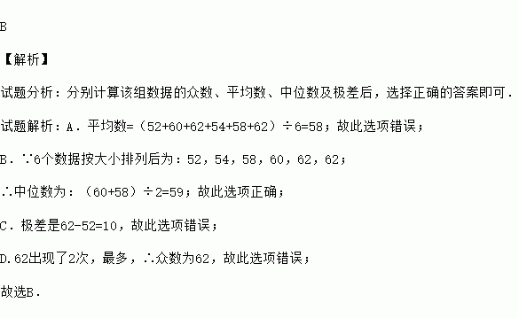 A.平均数是60 B.中位数是59 C.极差是40 D.众数是58