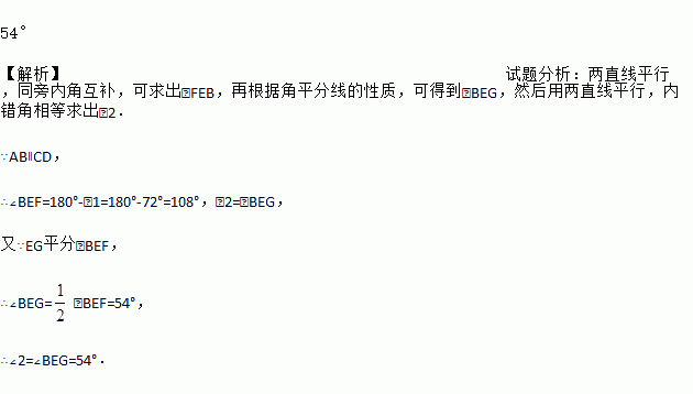 如图,AB∥CD,直线EF分别交AB、CD于E、F,EG平分∠BEF,若∠1=72°,则∠2= ______.
